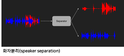 화자분리는 아래 그림처럼 두사람 이상이 동시에 발성을 했을 때 음성이 겹치는 것을 분리하는 기술입니다.