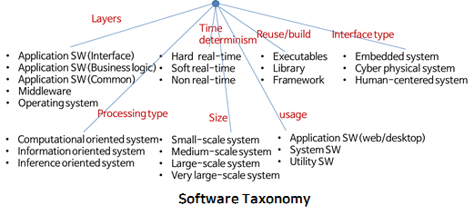 agile 수명주기 모델을 적용하여 개발을 하는 것은 매우 중요한 방향입니다. 그러나 SCRUM과 같은 agile 기반의 모델을 무조건 적용하는 것이 모든 문제를 해결하는 것은 아니라고 생각합니다. 소트프웨어의 종류는 바라보는 관점에 따라 다양합니다. 소프트웨어라도 다 같은 소프트웨어가 아니라는 의미입니다. 예를 들어 적용분야에 따라, 크기에 따라, 처리하는 업무에 따라 그 성격이 상이합니다. 즉 하나의 동일한 방법으로 모든 소프트웨어를 개발한다는 것은 무리가 있습니다. 그렇다고 아래 그림의 소프트웨어 분류마다 다른 방법을 적용하는 것도 어렵습니다.