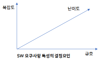 첫번째, 규모는 소프트웨어의 요구사항의 크기를 의미하며 구현될 소프트웨어 코드의 양과 비례한다고 볼 수 있습니다. 소프트웨의 크기를 요구사항을 기반으로 예측하기 때문입니다. 두번째는 복잡도입니다. 복잡도는 요구사항을 결정하는 정도를 의미합니다. 요구사항의 결정이 쉬운 시스템이 있고 어려운 시스템이 있을 수 있습니다. 시스템과 관련한 액터의 수와 성격에 따라 요구사항의 복잡도가 결정됩니다. 세번째, 난이도는 요구사항을 구현하기 어려운 정도를 의미합니다. 특정한 전문지식이 요구되는 계산중심의 시스템과 단순히 입출력만 수행하는 시스템과는 난이도가 많이 차이가 납니다.
