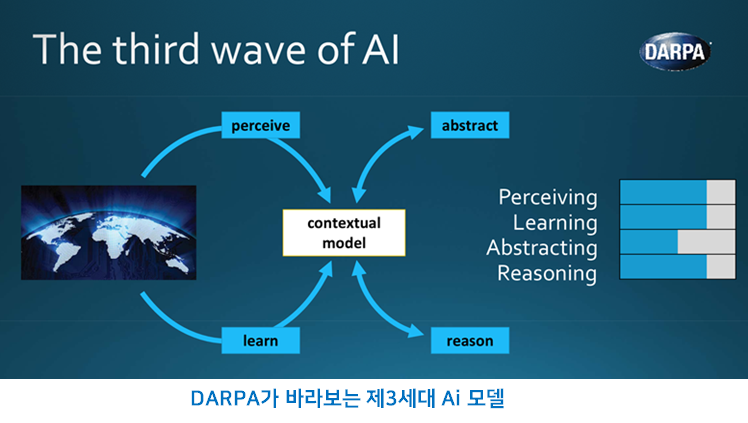 DARPA는 신뢰성, 안전성, 보안성, 생존성 등을 요구하는 defense system과 같은 dependable system에는 학습데이타에 양과 질에 의존적인 딥러닝 기반의 data-driven Ai는 한계가 존재한다고 인식하고 있습니다. 또한 ANI(artificial narrow intelligence)를 넘어 AGI(artificial general intelligence)로 발전하기 위해서는 새로운 인공지능 기술이 필요함을 인식하고 이를 위해서는 사람이 갖고 있는 상식이나 기본적인 배경지식을 포함하는 contextual model을 구축하는 것을 목표로 하고 있습니다.