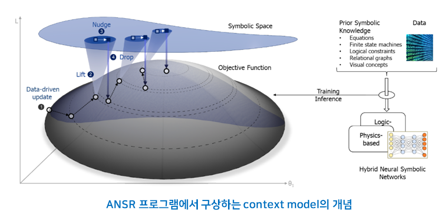 이러한 새로운 Ai의 접근을 contextual adaptation이라고 지칭하며 이를 위한 알고리즘과 구조를 개발하기 위한 ANSR(Assured Neuro Symbolic Learning and Reasoning)이라는 프로그램을 진행하고 있습니다. 이 프로그램의 이름에 포함된 Neuro Symbolic이라는 단어에서 알수 있듯이 이 프로그램은 인간의 지식을 표현하고 습득하는 기존의 1세대 Ai 기술을 지금의 딥러닝기술과 조합하려는 것으로 이해될 수 있습니다. (이러한 접근을 Neuro-Symbolic Ai라고 통칭하기도 합니다.)