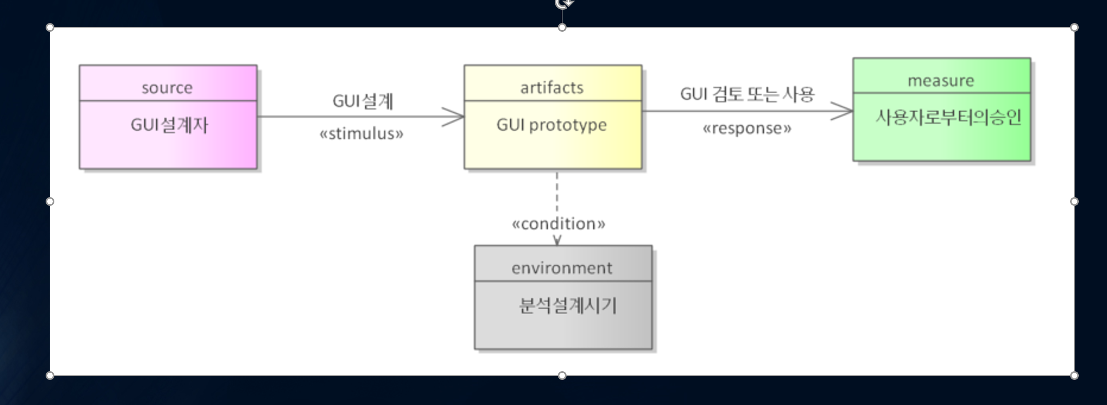 QAS의 모델은 6가지의 요소를 동일하게 형상화하여 모델링할 수 있습니다. 6가지의 요소중 자극과 반응을 화살표형태로 표현한 것처럼 association관계로 표현을 하고 나머지 4개는 객체로 표현할 수 있습니다. 예를들어 사용용이성이라는 모호한 요구사항을 아래와 같이 모델링할 수 있다.
