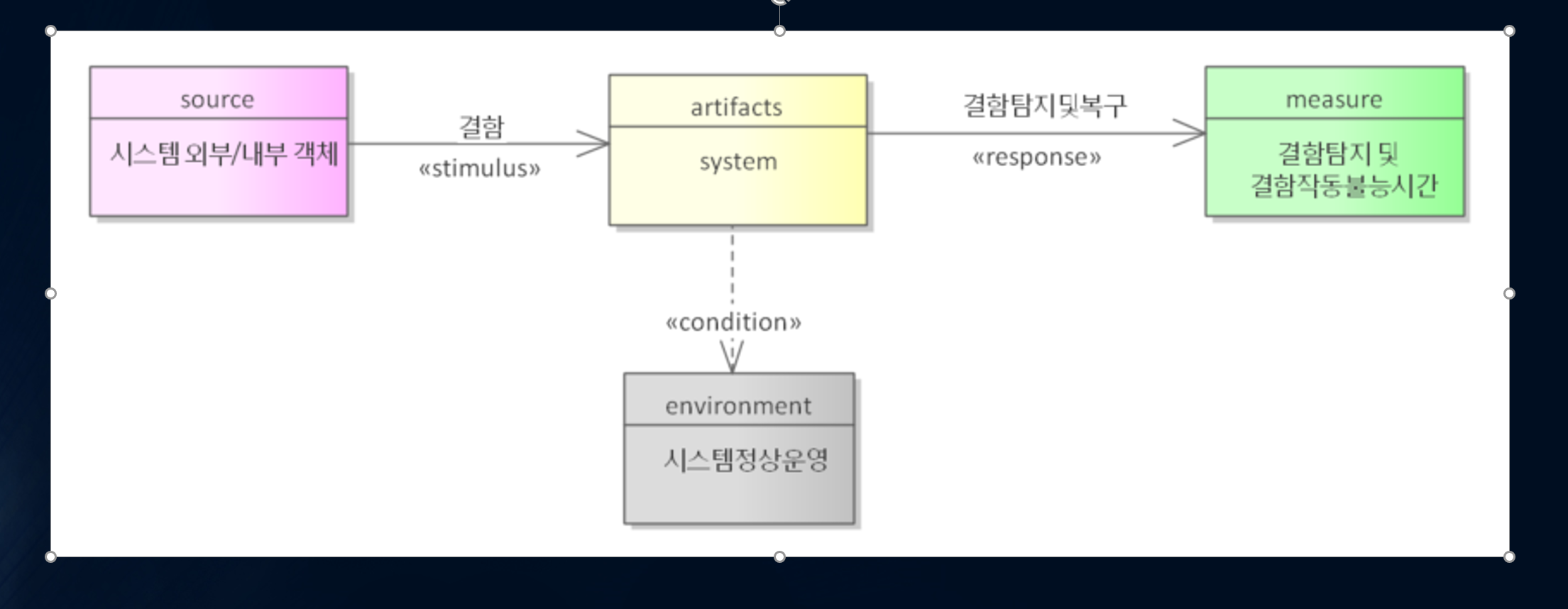 Quality Attribute Scenario는 카네기멜론 대학의 SEI(Software Engineering Institute)에서 제시한 방법으로 품질요구사항을 정형화된 형태로 정의하여 품질요구사항의 테스트용이성을 높일 수 있습니다.