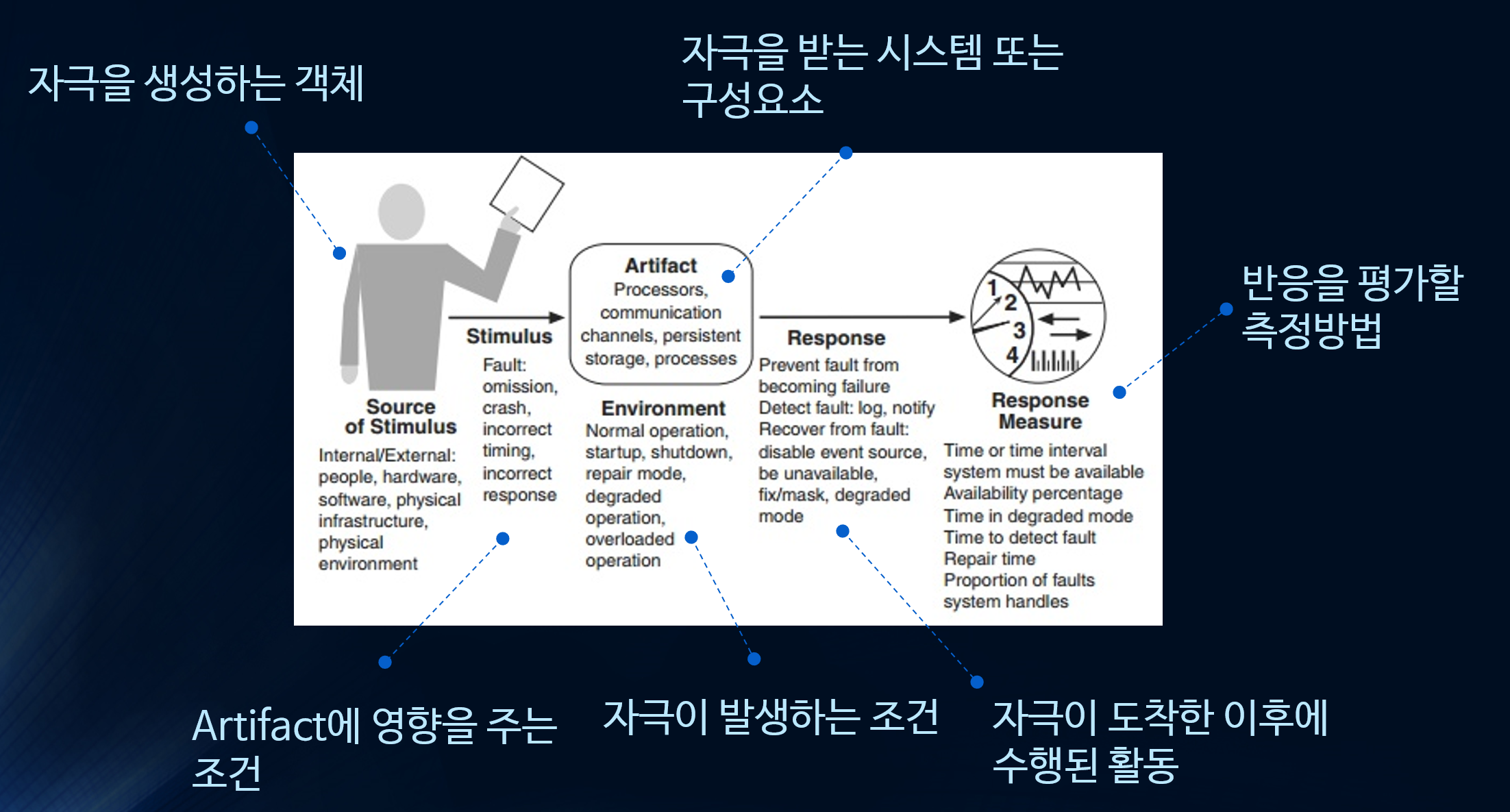QAS는 6가지의 요소로(자극을 생성하는 객체, 결과물에 영향을 주는 조건으로서의 자극, 자극을 받는 시스템 또는 다른 구성요소, 자극이 발생하는 조건을 나타내는 환경, 자극을 받아 이후에 수행되는 어떤 반응, 반응을 평가할 측정방법) 품질요구사항을 정형화한 모델로 기술합니다.