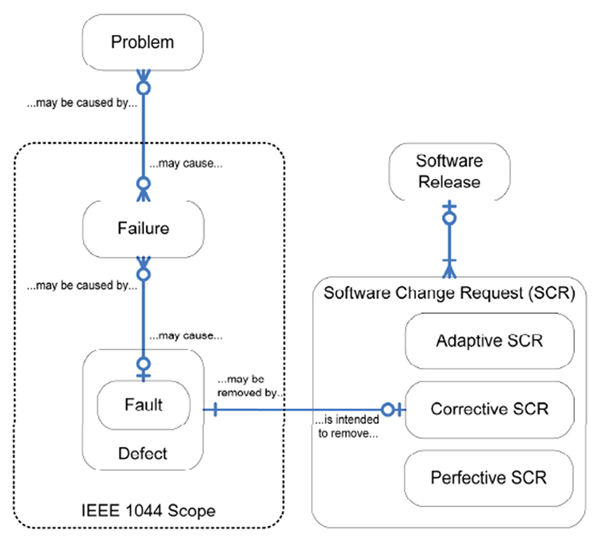 IEEE 1044에 따르면 defect에 따라 시스템의 Failure가 발생하고, 이것이 궁극적으로 어떤 문제를 야기하게 됩니다. 그리고 이러한 defect를 제거하는 것이 유지보수에서 Corrective Maintemence라고 합니다. 하여간 이러한 결함을 최소로 하는 것이 품질을 높이는 것이며, Verification과 Validation은 이 결함을 발견하는 품질보증활동이라고 할 수 있습니다. 특히 소프트웨어 시스템의 결함은 단순히 프로그램에 존재하는 결함만을 의미하는 것이 아니라 프로그램을 만들고 시험하기 위한 데이타 및 기술문서에 포함된 결함을 모두 의미한다.