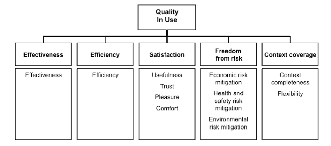 Quality in Use는 제품이 긍극적으로 존재하는 이유로서 제품을 개발하려는 목표라고 할 수 있습니다. 따라서 최상위의 요구사항이라고 할 수 있으며 제품 개발 후 실제 제품의 사용을 통해 측정이 가능하다고 할 수 있습니다. Product와 Data Quality는 결국 Quality in Use를 만족할 수 있어야 합니다. Product 및 Data Quality가 아무리 좋다고 하더라도 Quality in Use를 만족하지 못한다면 제품 개발을 통해 얻고자 하는 목표를 달성하지 못한 것이라 할 수 있습니다.