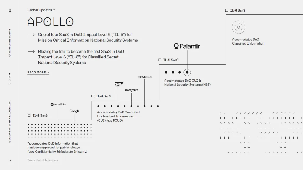 이러한 의미에서 Palantir는 사실 방산 유니콘이라고 하기에는 무리가 있어 보입니다. 이 회사는 SAP과 같이 기업의 비지니스를 지원하는 소프트웨어 회사로서, 데이타마이닝 분야의 소프트웨어 전문기업입니다. 정확하게는 데이타를 분석하는 솔루션을 기반으로 모든 조직의 모든 기능에서 DX를 가능케 하는 솔루션을 제공하는 기업처럼 보입니다. Palantir는 아래 그림의 2020년 Palantir의 투자자료를 보면 Palantir의 플랫폼이 국방부의 SaaS분야 영향력레벨에서 SAP보다 높은 6단계의 최고의 레벨로 인정을 받았습니다.