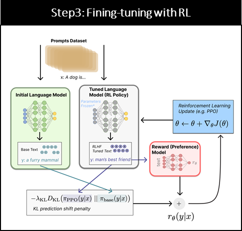 마지막 세번쩨 단계에서는 최종 학습모델을 개발하기 위해 초기 모델을 강화학습으로 fine-tuning하는 단계입니다. 초기 학습모델에서 출력한 결과에 대해 보상모델에서 출력한 보상값으로 학습모델의 정책을 학습해 가는 과정으로서 openAI에서 개발한 PPO(Proximal Policy Optimization)라는 policy 기반 강화학습방법으로 최종 chatGPT의 모델을 생성하게 됩니다. (강화학습의 전반적인 내용은 별도로 자세한 글을 올릴 계획에 있습니다.)