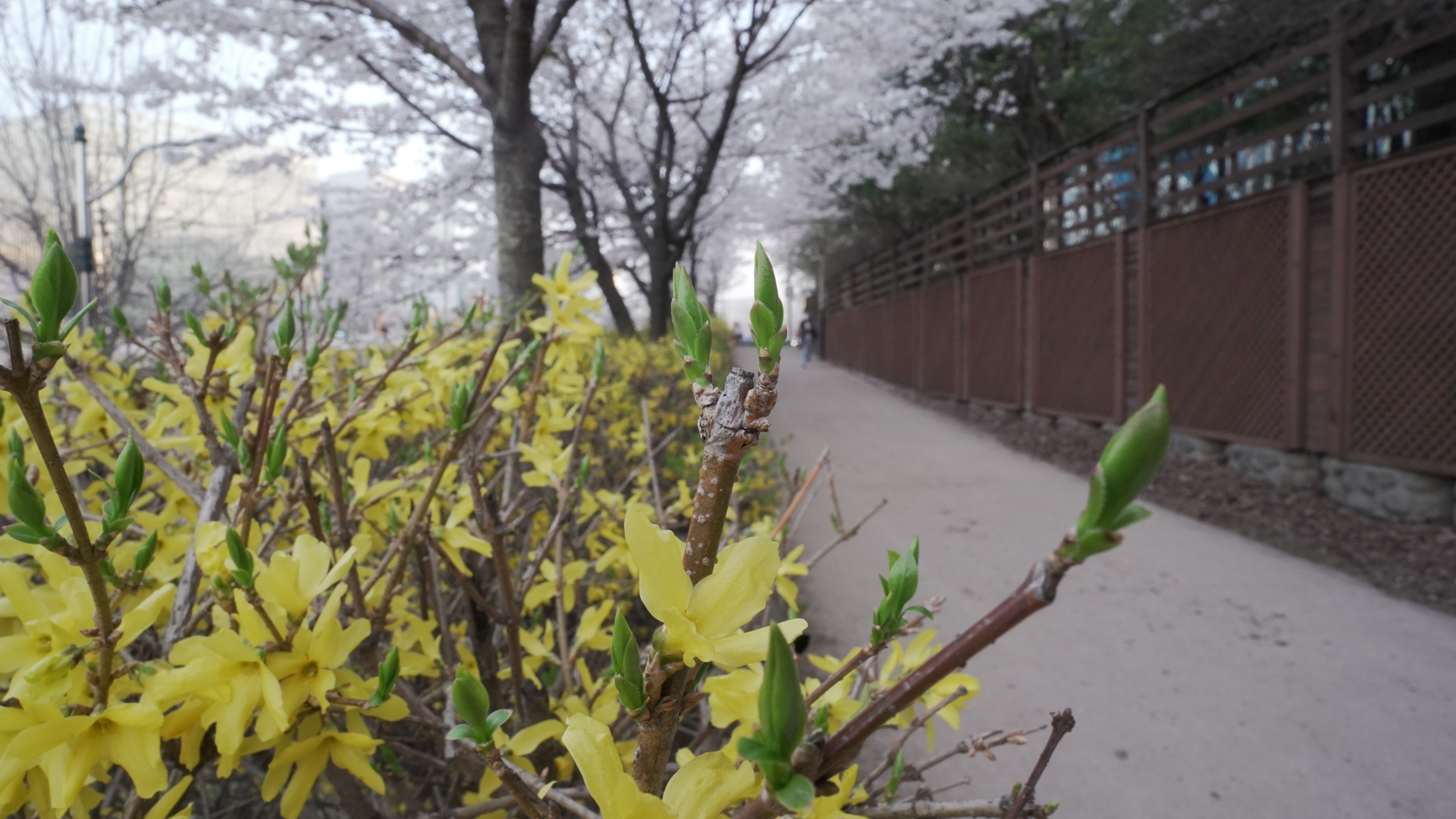 그리고 회사로 가는 길, 탄천에는 개나리도 함께 만개하여 정말 장관을 이루고 있었습니다. 오랜만에 이런 풍경을 담는 것에 흥분되었습니다. (결과는 사실 마음에 들지는 않았습니다만 오랜동안 판교의 직장생활에서 거의 15년만에 찍어보는 일인 것 같습니다.)