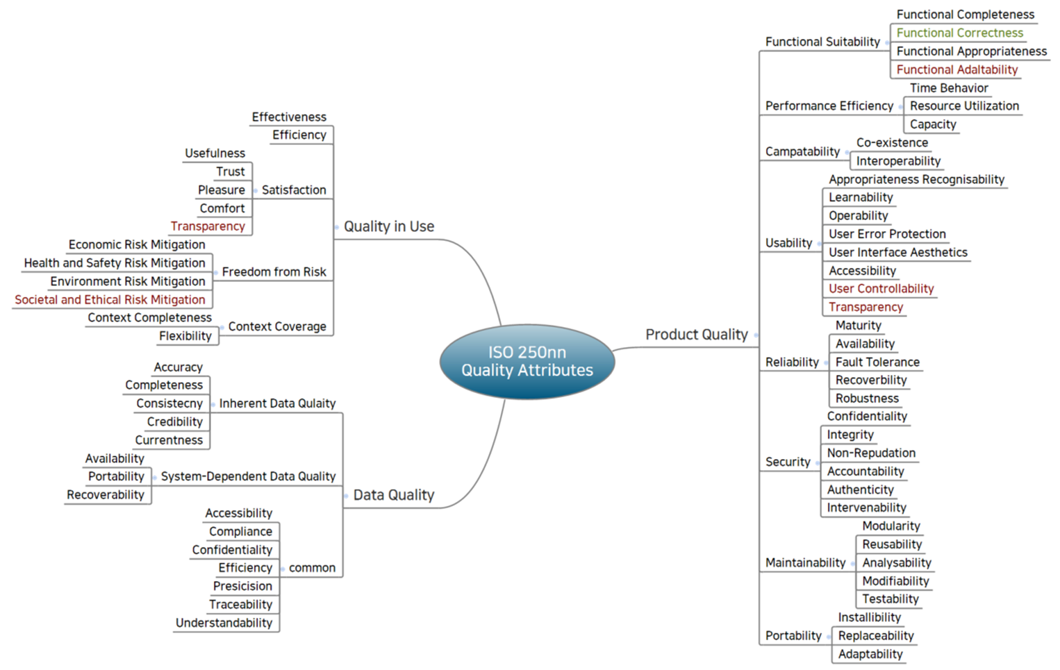 인공지능을 고려하여 ISO 25000에서 추가된 품질속성을 기존의 품질속성과 함께 구분하여 마인드맵으로 표현해 보았습니다. (아래 마인드맵에서 적색으로 표현한 부분이 인공지능으로 추가된 품질속성, 녹색으로 표현된 품질속성이 수정된 부분을 의미합니다.)