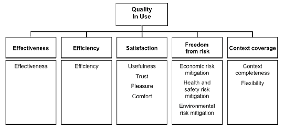 ISO/IEC 25010에서 정의한 Qaulity In Use는 최종 제품의 사용을 통해 얻을 수 있는 품질특성들로서 5개의 주특성과 11개의 부특성으로 정의되어 있습니다. 따라서 제품의 개발의 근거를 제시하는 최초의 품질모델이라고 할 수 있으며 용어에서 처럼 시스템운영에 대한 품질이므로 시스템 운영중에 품질을 확인하게 됩니다.