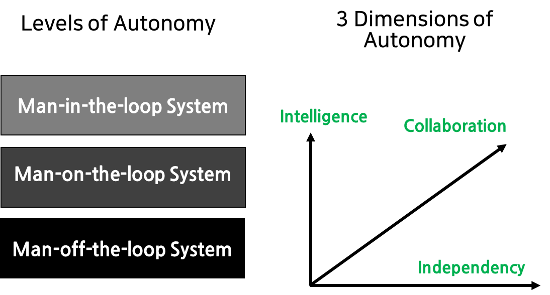 일반적으로 자율성을 사람의 통제 여부에 따라 크게 3가지로 구분할 수 있다. 가장 통제 높은 man-in-the-loop 시스템, 사람의 통제가 거의 없는 man-off-the-loop 시스템, 그리고 이 두 시스템 사이에 존재하여 최종의 통제 만을 수행하는 man-on-the-loop 시스템입니다. 이러한 통제의 수준은 상기 그림의 오른쪽처럼 Ai시스템의 지능화, 타 체계와의 협업 및 독립성에 따라 다양한 수준으로 존재하게 됩니다.