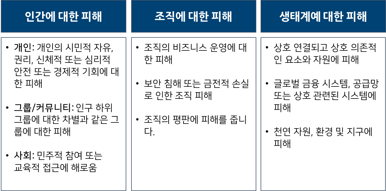 위험은 사건의 발생 확률과 해당 사건 결과의 크기 또는 정도에 대한 복합적인 척도를 의미합니다. Ai 시스템의 영향 또는 결과는 긍정적이거나 부정적이거나 둘 다일 수 있으며 기회 또는 위협을 초래할 수 있습니다. 잠재적인 사건의 부정적인 영향을 고려할 때 위험은 상황이 나 사건이 발생할 경우 발생할 수 있는 부정적인 영향 또는 피해의 크기 및 발생 가능성의 함수입니다. 부정적인 영향이나 피해는 개인, 그룹, 커뮤니티, 조직, 사회, 환경 및 지구에서 경험할 수 있습니다.