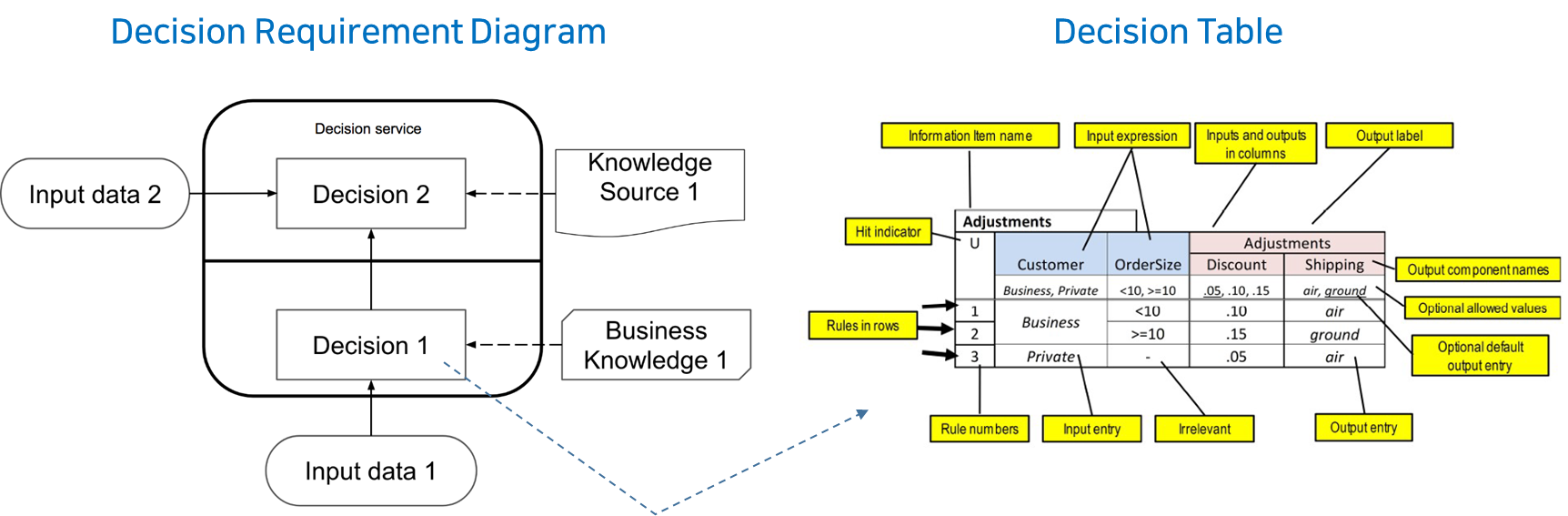 Decision은 입력을 받아 어떤 규칙에 의해 결정의 출력을 생성합니다. 이때 의사결정에 필요한 지식을 위한 참조 지식정보(Knowledge Source)와 비지니로직 등을 위한 정보(Business Knowledge)를 참조합니다. Decision의 규칙은 다양한 형태로 정의할 수 있습니다. 일반적인 스크립트 형태로 표현할 수도 있고, 예에서 처럼 Decision Table로 표현할 수도 있습니다. 사실 설계란 여러개의 설계 대안중에 하나를 선택하는 행위라고도 할 수 있습니다. 설계 대안은 설계시 고려할 품질 요구사항의 조합일 수도 있고, 설계 결과의 대안들일 수도 있습니다. 따라서 Decision의 입력은 설계 대안이거나, 설계의 목표가 되는 품질요구사항의 조합이 될 수 있습니다.