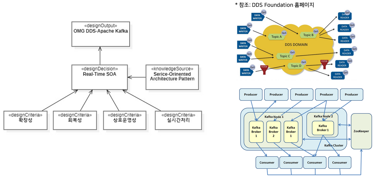 ESB(Enterprise Service Bus)라는 통신 미들웨어를 기반으로 각 서비스의 공통적으로 정의된 인터페이스를 통해 서비스들이 유연하게 통합 및 확장이 용이한 응용 서비스 아키텍처 패턴입니다. 예를 들어 무기체계에서는 Real-time SOA의 관점에서 DDS(Data Distribution Service)라는 통신 미들웨어 표준을 통해 SOA 패턴을 적용합니다. 그리고 일반적인 정보처리시스템에서는 Kafka라는 이벤트기반 미들웨어를 사용하여 구현하는 일반적입니다.