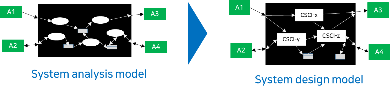 System Design이란 시스템의 구성요소인 하드웨어 컴포넌트들, 소프트웨어 컴포넌트들, 그리고 이들의 정적 및 동적 관계를 식별하는 것, 다시말해 설계 결정사항을 기획하고 이를 실행하는 것이라 할 수 있습니다. 당연히 설계를 위한 입력은 시스템의 분석모델들입니다. 다른 관점에서 표현하면 시스템의 기능을 하드웨어와 소프트웨어 컴포넌트로 변환하는 것이라고 할 수 있습니다. 따라서 이를 기능할당(Functional Allocation)이라고 합니다. 다시말해 컴포넌트를 식별한다는 것이 시스템의 컴포넌트들이 수행할 기능을 결정하는 것과 같다고 할 수 있습니다.