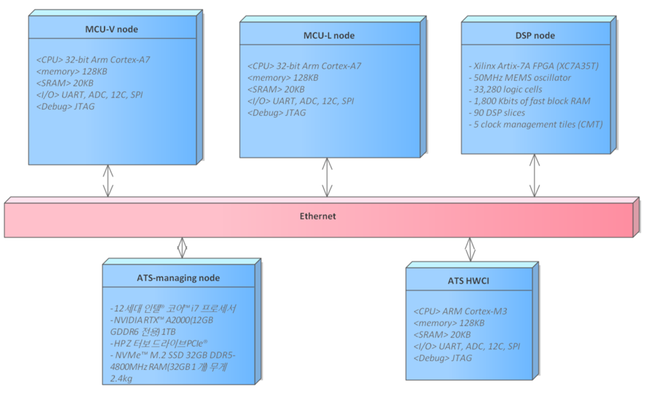 소프트웨어 시스템의 Hardware Architecture Model은 컴퓨터시스템 구조를 표현하기 위해 UML의 Deployment Diagram을 이용하여 모델링합니다. 각 컴퓨팅노드는 입체 사각형으로 표현되며 각각의 컴퓨팅노드의 모델, 사양 등을 필요에 따라 기술하며 이는 시스템의 규모의 예측결과를 반영하여 계속 업그레이된 모델로 변경될 것입니다.