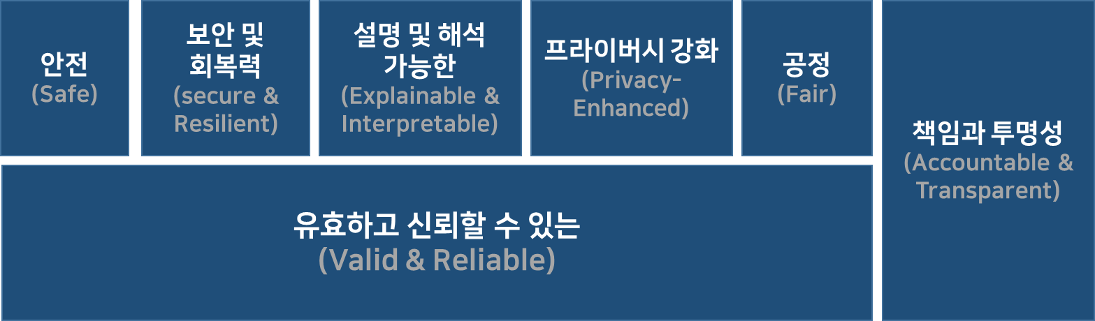 Reliability로서의 신뢰성은 Trutstwaorthiness에 포함되는 중요한 품질속성으로 소개하고 있습니다. 따라서 Trustworthy Ai 시스템은 그림에서의 특성으로 볼 때 안전성, 보안성, 공정성, 투명성 등 Realiability를 포함하여 다양한 속성을 포괄적으로 포함하는 개념이라고 할 수 있습니다.