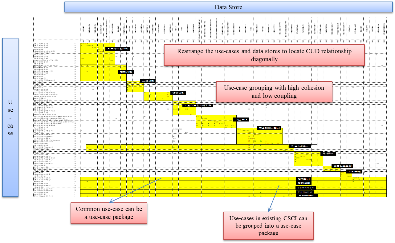 위의 그림의 행은 use-case이고 열은 data store를 의미하며, 해당 셀들은 CRUD(Create, Read, Update, Delete)를 표시한다. 이때 CRUD관계에서 data store에 CUD의 관계를 갖는 use-case들을 행열을 조종하여 재배치하여 같은 data store를 C,D, U하는 유스케이스들을 그룹핑하여 유스패키지로 구성한다.