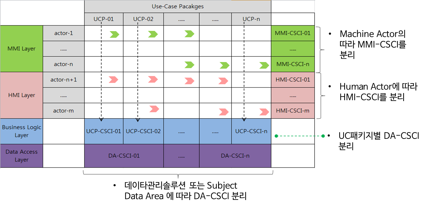 Application Architecture는 상기 그림에서 보듯이 최종적으로 Interface, Business Logic, Common, Data Entity Layer의 Layered Architecture에 존재하는 CSCI들로 구성된다. 위에서 상술한 유스패키지는 최종적으로 Interface와 Business Logic Layer의 CSCI 를 설계하기 위한 기본적인 논리적 CSCI로서 Interface Layer를 구성한 CSCI를 각 Actor를 중심으로 분리하여 최종 물리적인 CSCI를 식별한다.