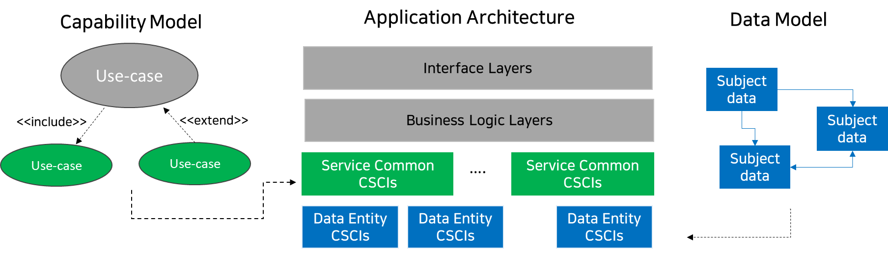 특별히 Architecture Pattern에서 Data Entity Layer에 해당하는 CSCI를 Data를 관리하는 솔루션과 Subject Area(즉, Data Architecture의 도메인)를 중심으로 CSCI를 구분하여 공통 CSCI를 식별한다. 특히 subject data area를 기반으로 구성된 CSCI들은 Data Architecture를 구성하기 위한 솔루션들과 직접적으로 연관을 갖게된다.