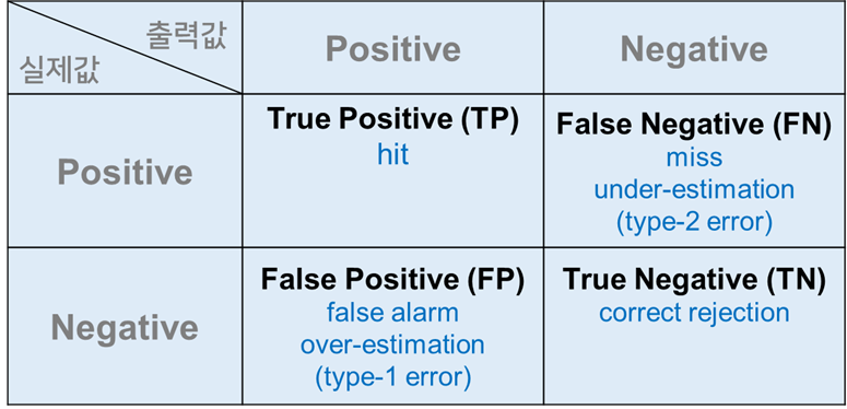 아래 그림은 Confusion Matrix(혼동행렬)를 설명하는 표로, 머신러닝 및 통계 분석에서 모델의 성능 평가를 위해 자주 사용됩니다. 혼동 행렬은 예측값(출력값)과 실제값의 조합을 비교하여 모델이 얼마나 정확히 분류했는지 분석하는 데 사용됩니다.