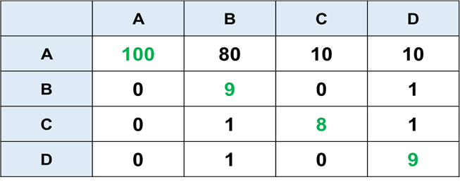 첫번째 행이 의미는 이 모델이 A를 A라고 맞춘 경우가 100개이고, 나머지는 A가 아니라 B, C, D로 각각 80, 10, 10개 잘못 맟춘 경우를 보여주고 있습니다.