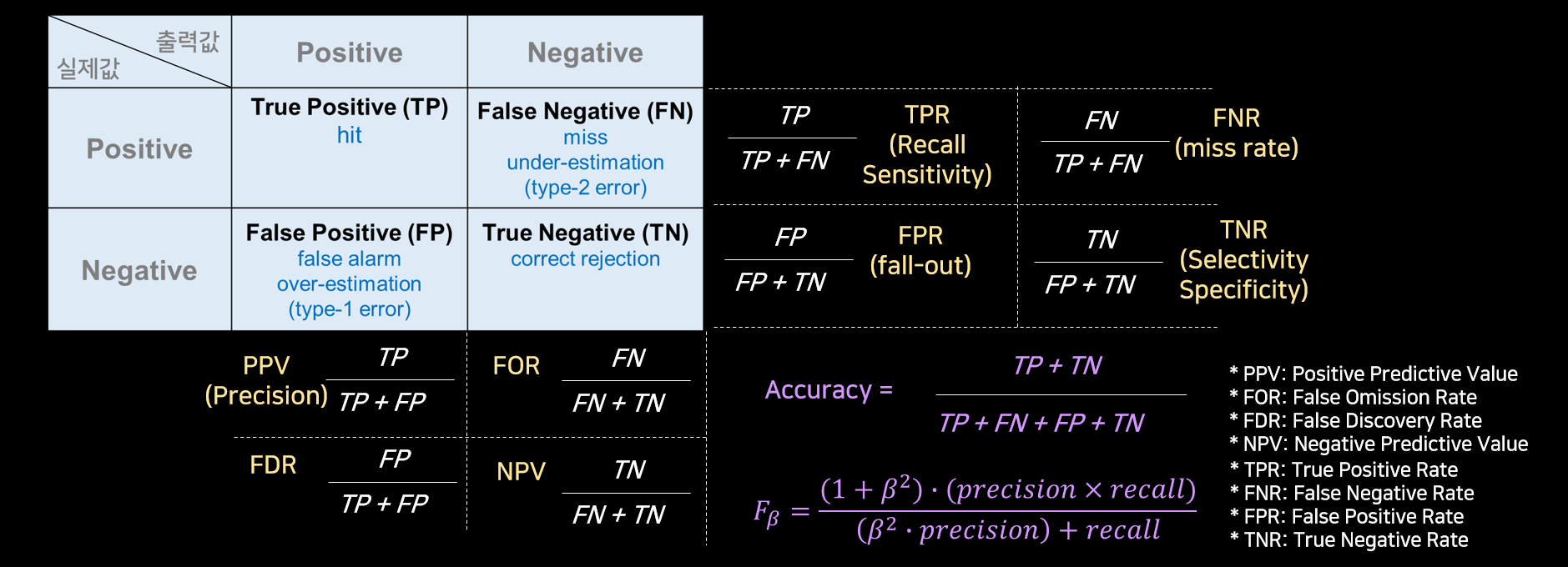 가장 일반적이며 전체적인 상황을 사용하는 지표는 보라색으로 기술된 Accuracy(정확도)와 Fβ입니다. 특히 Fβ의 경우는 Precision(정밀도)과 Recall(재현율)의 가중치를 동일하게 하는 β =1인 F1-Score입니다. 모델에 따라 한 종류에 치중되는 불균형데이타를 사용하여 학습된 모델을 평가하는 경우 정확도가 모델의 특성을 반영하기 어려운 경우 F1-Score를 사용하게 됩니다.