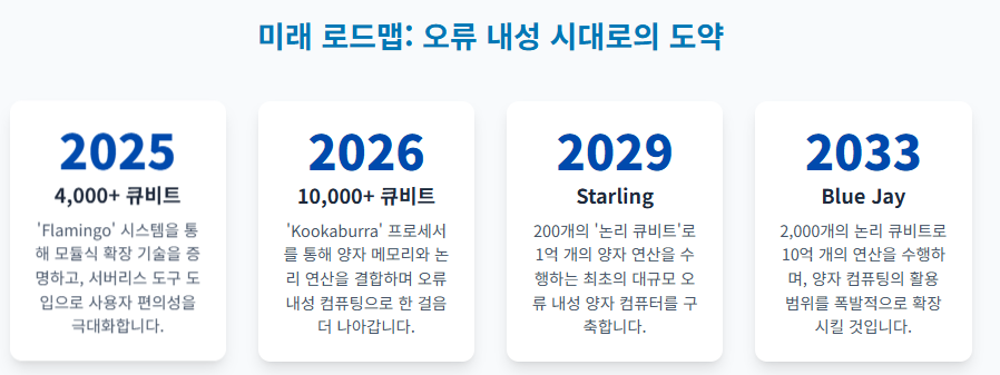 - 4,000큐비트 이상 시스템: 2025년까지 모듈식으로 확장된 프로세서들을 연결하여 4,000큐비트 이상의 양자 시스템을 개발할 계획입니다.