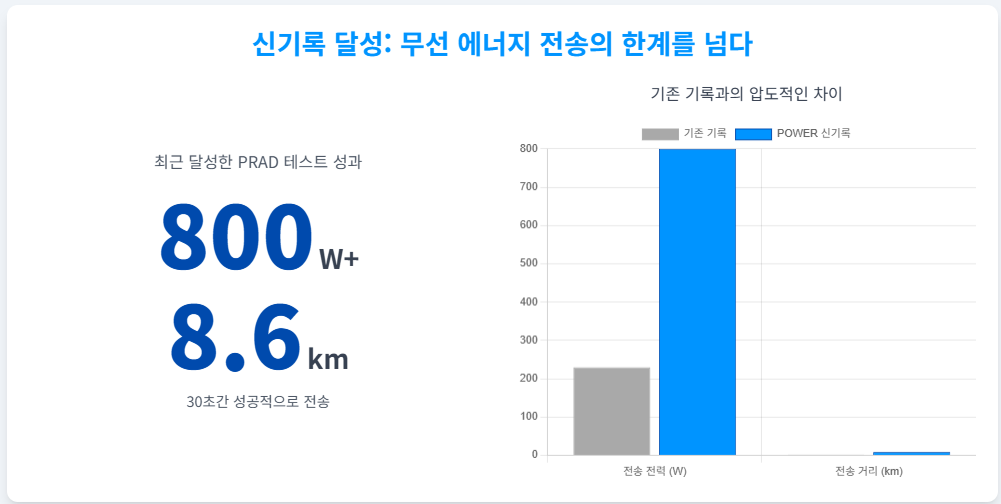 - 전송 거리 및 전력: 8.6km (약 5.3마일) 떨어진 거리에서 800와트(W) 이상의 전력을 30초간 성공적으로 전송했습니다.