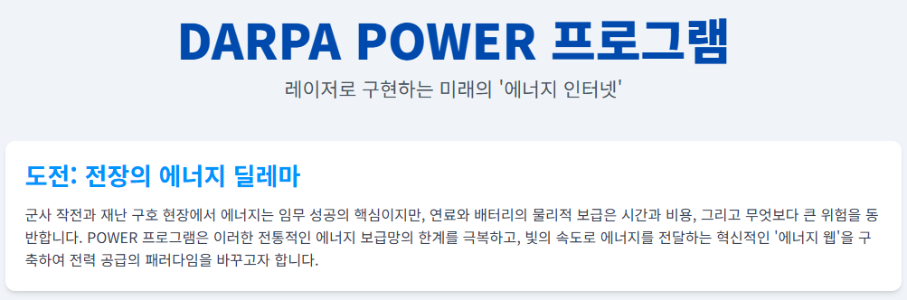 전통적인 군사 작전이나 재난 구호 현장에서 연료와 배터리 등 에너지원은 보급에 막대한 시간과 비용, 위험이 따르는 병목 현상의 주원인이었습니다. POWER 프로그램은 이러한 물리적 보급망의 한계를 극복하고, 전력 공급의 패러다임을 바꾸기 위해 시작되었습니다.