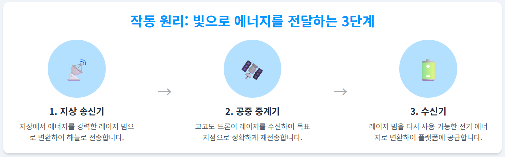 - 공중 중계기 (Airborne Relay): 고고도에 떠 있는 항공기나 드론에 탑재된 중계기가 지상에서 온 레이저 빔을 수신한 뒤, 에너지가 필요한 다른 공중 또는 지상 플랫폼으로 정확하게 재전송합니다.