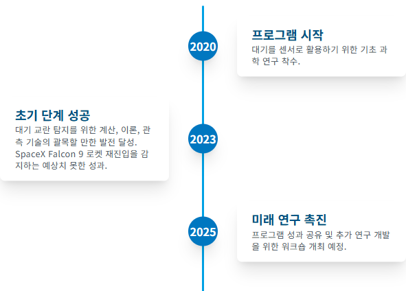 이러한 성공을 바탕으로 2025년 4월에는 추가적인 연구 개발을 촉진하기 위한 워크숍이 개최되기도 했습니다. AtmoSense는 우리가 대기를 이해하고 활용하는 방식에 혁명적인 변화를 가져올 수 있는 잠재력을 가진, 미래 지향적인 프로그램입니다.