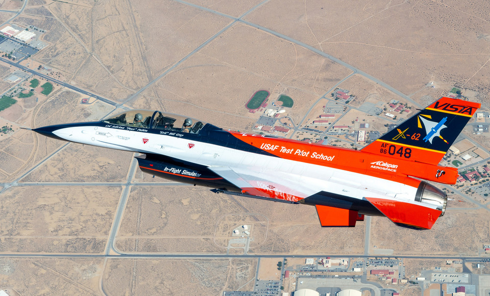 AI 에이전트가 제어하는 F-16 전투기(VISTA)가 캘리포니아 주 에드워즈 공군기지 상공을 비행하고 있는 모습으로 이 항공기는 NF-16D에서 X-62A로 재지정되었다.(사진:록히드마틴)
