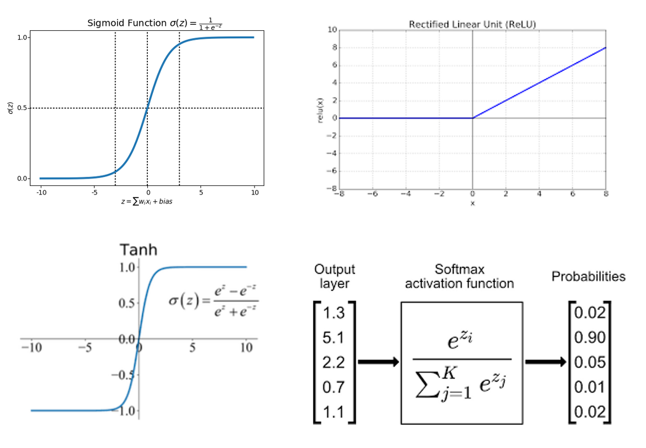 AN의 최종 출력은 위의 마지막 함수(z)에 의해 결정이 됩니다. 이를 활성화함수라고 합니다. 활성화함수는 뉴런이 신호를 전달할 때 막전위가 활동전위로 변할 때 전달되는 것을 모델링한 것입니다. 활성화함수는 각 AN의 출력을 결정하고 이 출력이 연결된 AN들에 입력되기 때문에 ANN에서 매우 중요한 함수입니다. 이 활성화함수는 AN이 존재하는 계층과 특성에 따라 다양한 함수를 사용하는데 그 대표적인 함수들을 이해하는 것이 필요하다고 생각합니다. 그 중 대표적인 것이 sigmoid, ReLU, tanh, softmax함수 입니다.