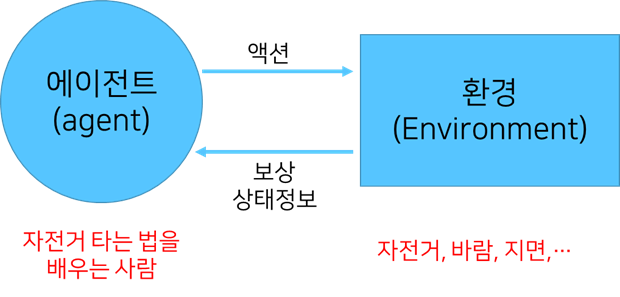 위 그림은 강화학습의 기본개념 및 용어에 대해 설명한 그림입니다. 에이전트는 학습을 수행하는 객체입니다. 환경은 상태에 영향을 주는 주변의 다른 객체들 이라고 할 수 있습니다. 자전거 타는 법 배우기에서 배우는 사람이 에이전트라면 자전거 타는 것에 영향을 주는 환경은 자전거, 바람, 지면 등이 있을 것입니다. 자전거를 타기 위해서는 페달을 밟고, 핸들을 움직이는 어떤 행동을 취하게 됩니다. 그러면 이에 대해 넘어지지 않고 잘 가는 경우는 보상을 받고, 넘어지는 경우는 보상을 받지 못하게 됩니다. 다시 말해 자전거 타는 법을 배우는 사람은 자기가 한 행동에 대한 보상이 최대가 되는 방향으로 행동을 취하도록 학습을 한다는 것입니다.