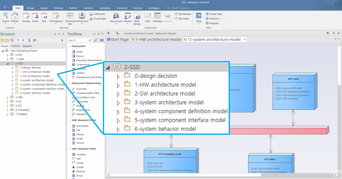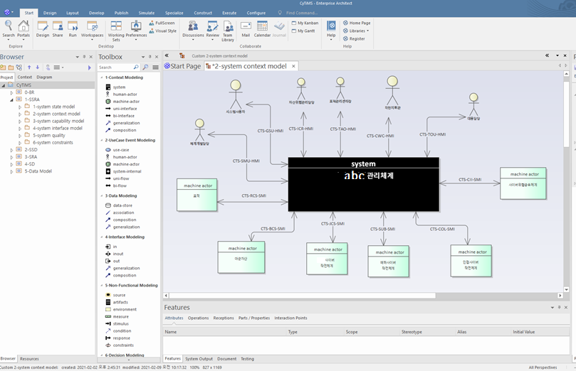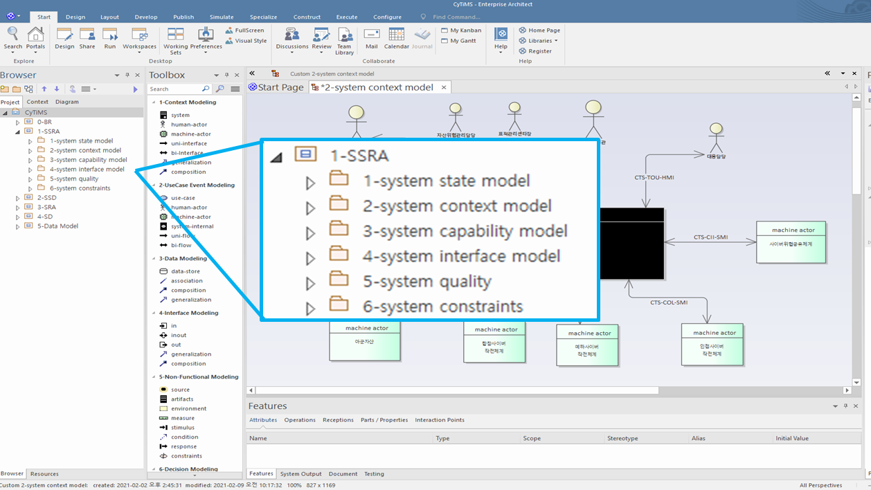 본 강좌에서 사용하는 UML도구는 Sparx사의 Enterprise Architecture, 줄여서 EA라는 도구를 활용하여 SSDM에서 정의한 스테레오타입을 적용한 툴박스를 추가로 적용하여 사용합니다. 아래 보시는 화면은 EA의 화면입니다. 가장 왼쪽은 해당 모델들의 구조를 마치 OS의 파일구조와 거의 유사한 형태로 나타내고 있는 브라우저창입니다.
