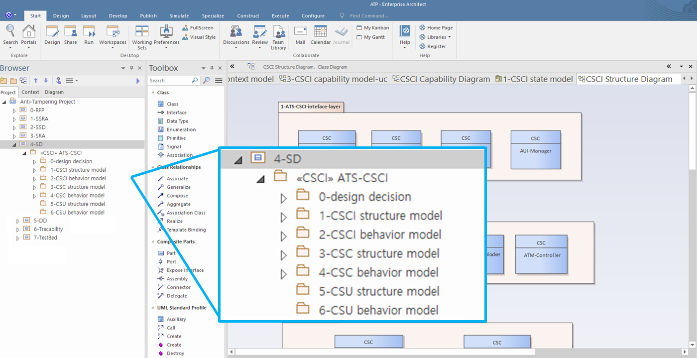 Design decision이 있는 것은 동일합니다. 다만 다른 점은 그 범위가 특정 소프트웨어 형상관리항목인 CSCI별로 진행이 된다는 것입니다. CSCI 설계에서는 CSC, CSU의 구조를 포함하는 각 structure model이 정의 되고, 이들 간의 동적실행모델인 behavior 모델이 각각 포함되어 있습니다.