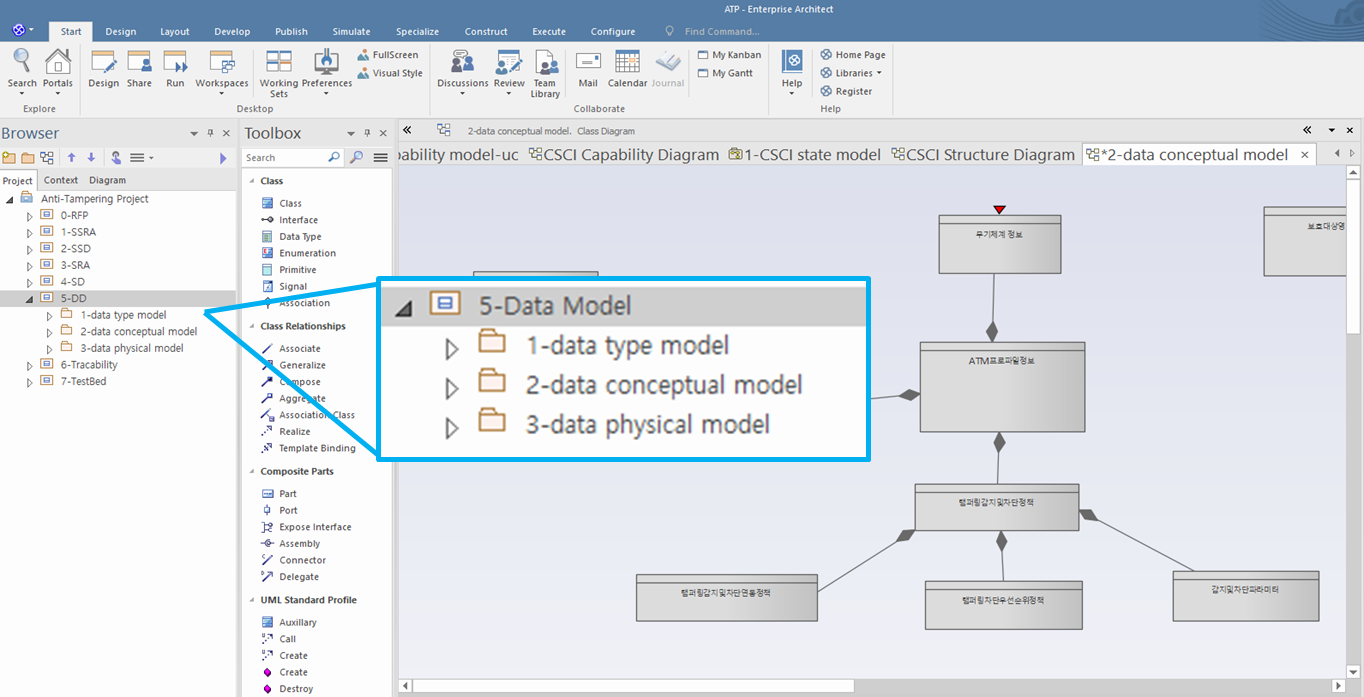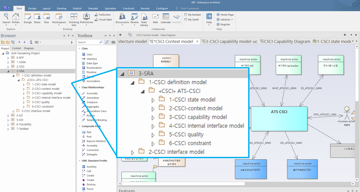 그림의 예제에서 CSCI definition model이라는 폴더 아래 각 CSCI별로 시스템분석모델과 동일한 6가지의 분석모델이 포함되는 구조로 정의됩니다. CSCI의 개수에 따라 해당 CSCI 폴더의 수가 존재하게 됩니다. 본 그림에서는 ATS-CSCI에 대한 CSCI의 분석모델을 포함하고 있습니다. 폴더구조에서 맨 마지막에 있는 CSCI interface model은 CSCI간의 공통적인 인터페이스를 정의하기 때문에 CSCI definition model과 같은 레벨로 SRA 모델 바로 아래의 폴더로 구성되어 있습니다.