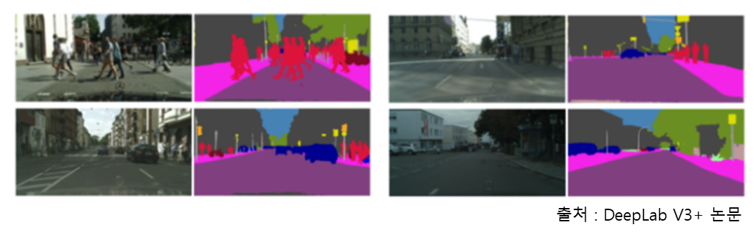 semantic segmentation(의미적 분할)은 컴퓨터비전의 핵심적인 분야에 하나입니다. 결론적으로 말하면 사진에 있는 객체들의 경계를 구분하는 것을 의미합니다. 아래 그림은 구글의 DeepLab V3+라는 논문에 나온 semantic segmentation의 예입니다.