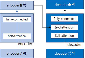 transformer 구조 그림을 기준으로 기계번역을 예로 설명하면 다음과 같습니다. 원본 문장을 처리하는 encoder입력은 원본 문장들을 나타냅니다. 이 원본 문장을 입력으로 각 문장에 존재하는 단어들의 관련성을 식별하기 위한 self-attention을 수행한 후, 일반적인 전방향 신경망을 거쳐 원본문장을 처리한 상태를 출력합니다. 그리고 decoder는 대응되는 번역문장을 입력 받아 동일하게 번역문장 내의 단어들간의 self-attention을 수행한 후 encoder의 출력과 encoder-decoder attention을 수행하여 일반적인 신경망을 거처 최종적으로 각 번역 문장의 예측값을 출력합니다.