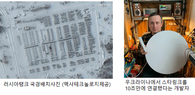 우크라이나는 많은 동맹들로 부터 무기체계 뿐만 아니라 기존의 상용위성과 같은 기존 인프라의 지원을 받아 전쟁을 수행하였습니다. 예를 들어 SpaceX로 부터 통신위성을 지원을 받거나, 상용정찰위성 회사들로부터 실시간으로 러시아군 탱크 현황 등을 지원받았습니다. 군사적으로 구축된 시스템보다 더 신속하고 효율적으로 전쟁에 사용되었습니다.