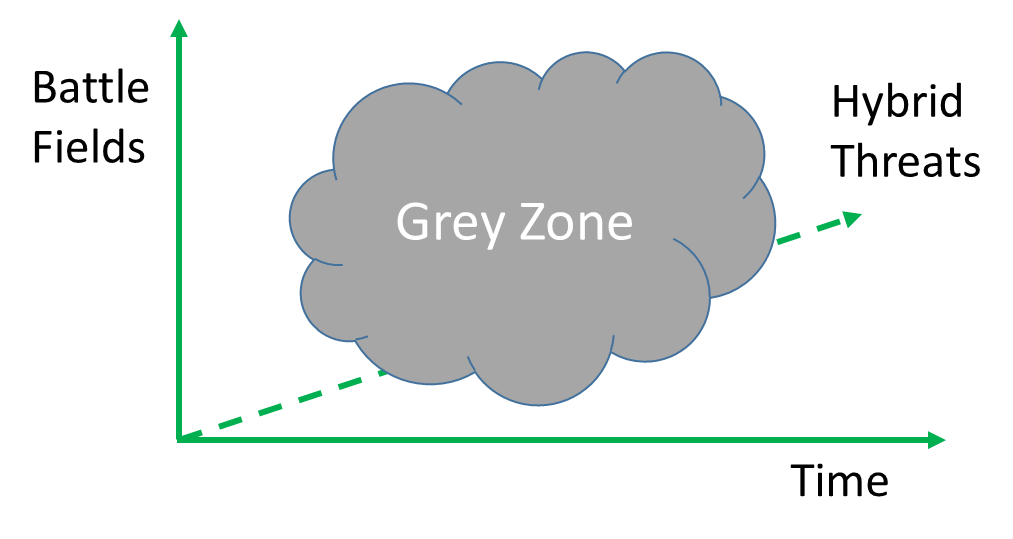 Hybrid Warfare의 가장 중요한 특징은 Grey Zone(회색지대)이라는 말로 그 특징을 설명할 수 있다고 할 수 있습니다. 회색지대라는 용어도 정해진 정의가 존재하지는 않지만, "전통적인 전쟁과 평화의 이중성 사이에 있는 국가 및 비국가 행위자 간의 경쟁적 상호작용.", "주로 국가가 국가 자원을 사용하여 다른 국가를 의도적으로 강요하는 인간 활동의 비군사적 영역", "일상적인 국가 전략과 공개 전쟁 사이 어딘가에 있는 경쟁 경기장." 등으로 이야기되고 있습니다.