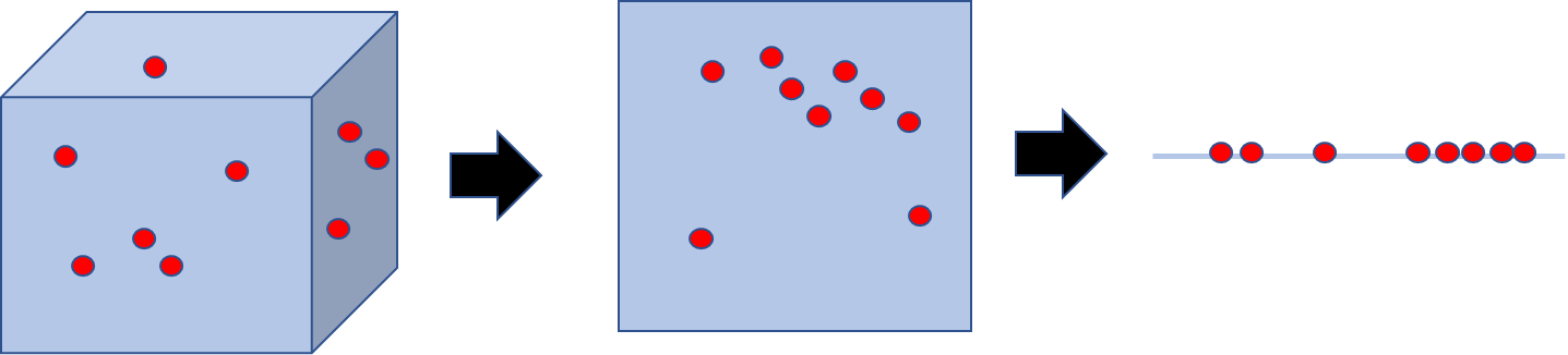 차원축소를 단어적으로 쉽게 이해할 수 있는 것은 고차원을 저차원으로 축소한다는 것입니다. 우리가 인지할 수 있는 공간의 개념에서 설명하면, 3차원의 데이타를 2차원의 데이타로, 2차원 데이타를 1차원으로 변환하는 것입니다.