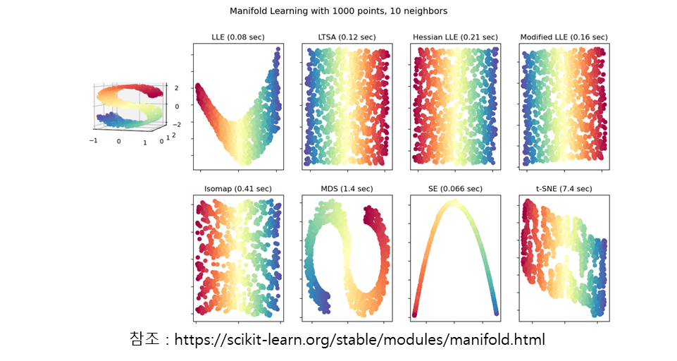 차원축소를 이해하기 위해 필요한 또 다른 개념이 매니폴드(manifold)입니다. 매니폴드는 고차원의 공간을 저차원으로 매핑하는 subspace를 의미한다고 할 수 있습니다. 고차원의 공간에 분포된 데이타의 특징을 잘 표현하는 subspace인 manifold를 찾는 것이 결국 차원감소의 방법이 되며, 이를 manifold learning이라고도 합니다.