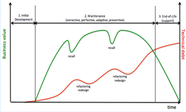 위의 그림은 앞의 그림과 유사하지만, 소프트웨어 가치와 기술부채와의 관계 관점에서 표현한 그림입니다. 소프트웨어는 운영유지되면서 변경이 발생하고, 변경을 통해 그 가치가 어느 정도 올라가지만 시장의 요구사항을 계속적으로 수용하지 못하면 소프트웨어의 결함으로 이어져 기술부채가 증가함을 보여주고 있습니다.