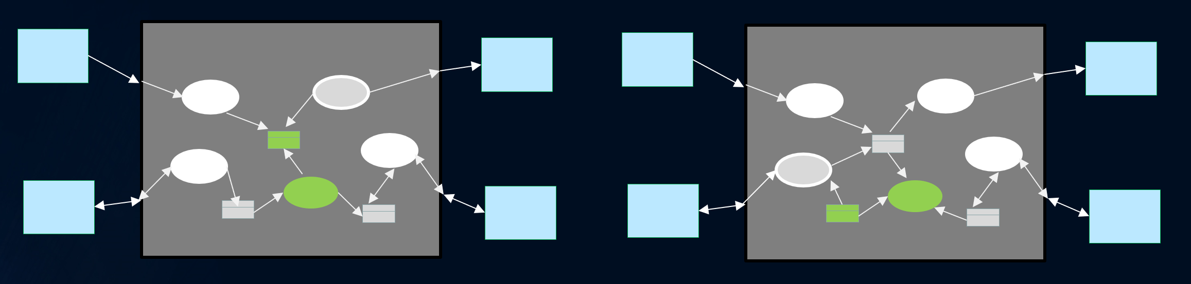 위 그림에서 초록으로 표현된 부분이 black hole과 white hole의 예를 나타내고 있습니다. 왼쪽 그림은 black hole 데이터장소 및 white hole 유스케이스를, 오른쪽 그림은 black hole 유스케이스와 white hole 데이터저장소를 각각 나타내고 있습니다.