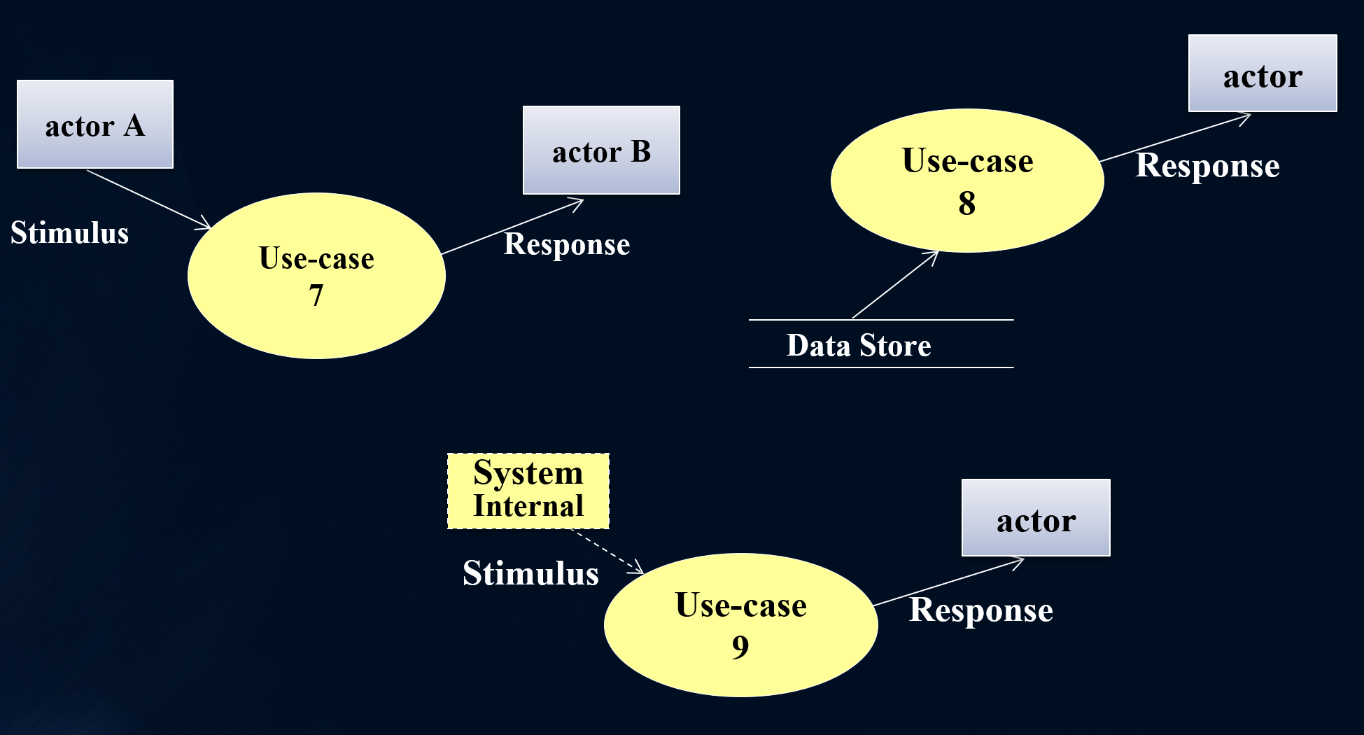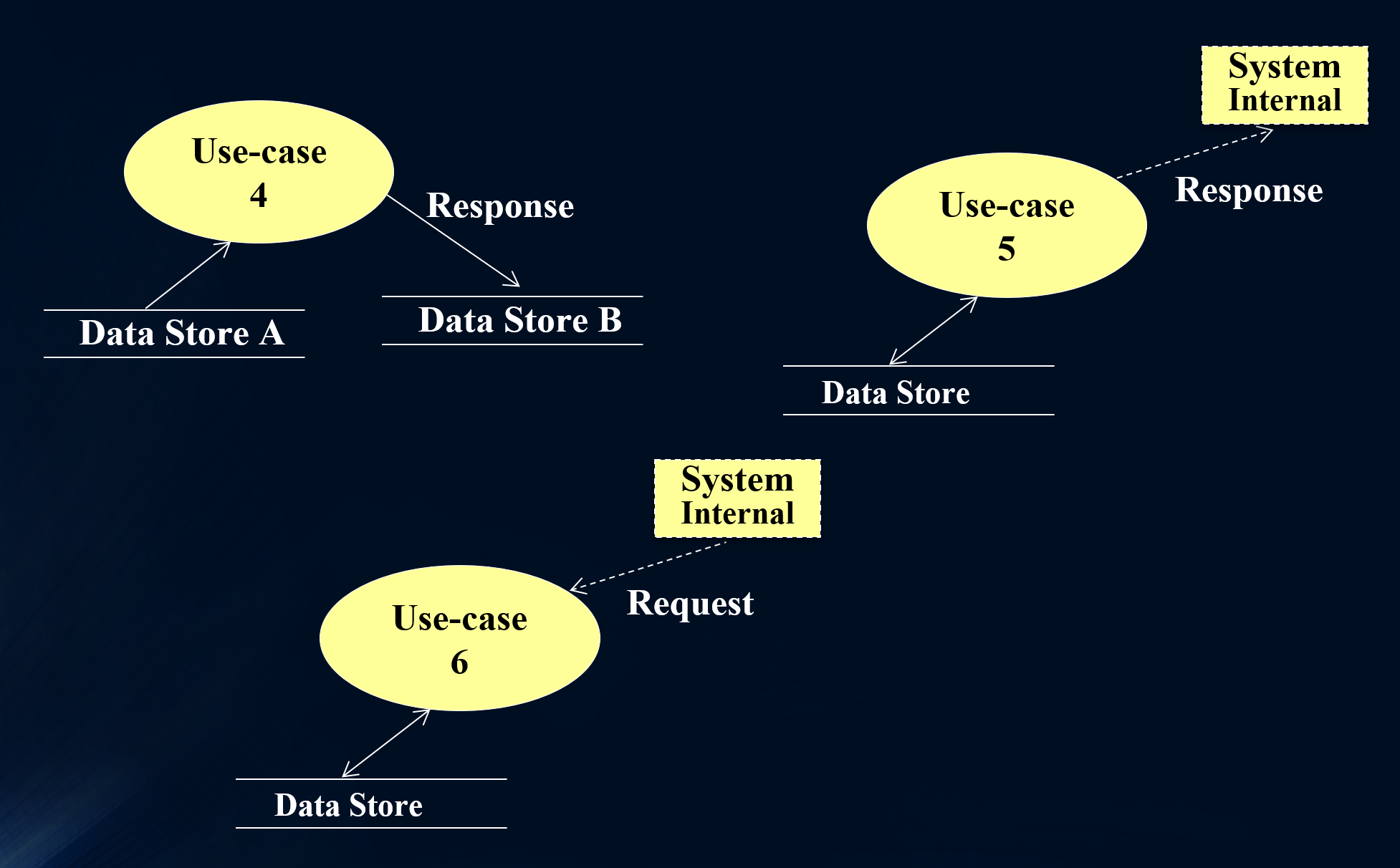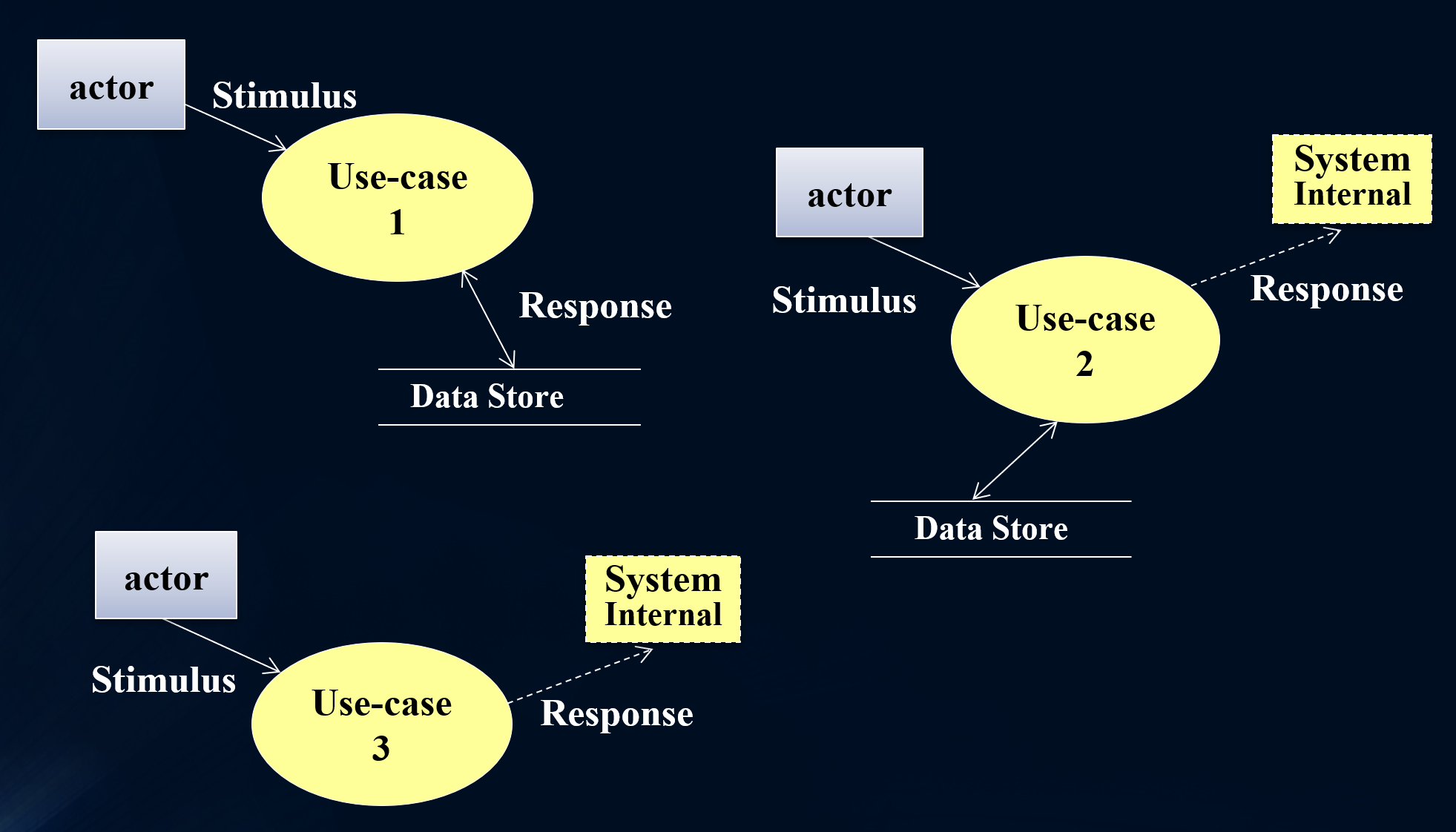 위 그림에서 system internal은 명확한 데이터저장소로 모델링할 수는 없으나 시스템 내부에 어떤 반응을 모델링하기 위해 사용하는 개념입니다. (그러나 가능한 system internal로 모델링하는 것은 지양하는 것이 좋습니다.)