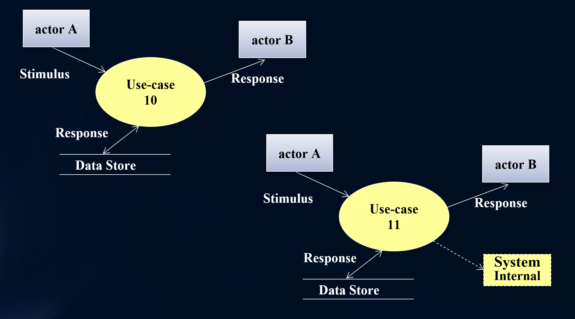 이 유스케이스의 출력은 A+B입니다. 그러나 B라는 데이터는 외부로 부터 입력되지 않습니다. 그러나 B라는 데이터가 그림상으로는 데이터저장소에 유지되고 있습니다. 이 그림만으로는 다양한 해석이 가능합니다. 바로 이러한 해석을 확인하는 것이 시스템을 분석하거나 결함을 발견하는 것이라 말할 수 있습니다.