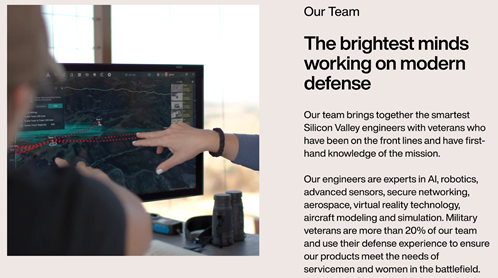 Anduril 뿐만 아니라 미국의 인력구성은 전문가 집단,다시말해 Functional Specialist들로 구성된다는 것입니다. AI, 로보틱스, 첨단 센서, 보안, 항공, VR, modeling & Simulation, 그리고 20%의 예비역입니다. 이 예비역 들은 영업 만을 위해서 존재하는 것이 아니라 제품의 요구사항이 고객들의 요구사항에 적합하도록 보장하는 국방 제품기획 전문가들입니다.